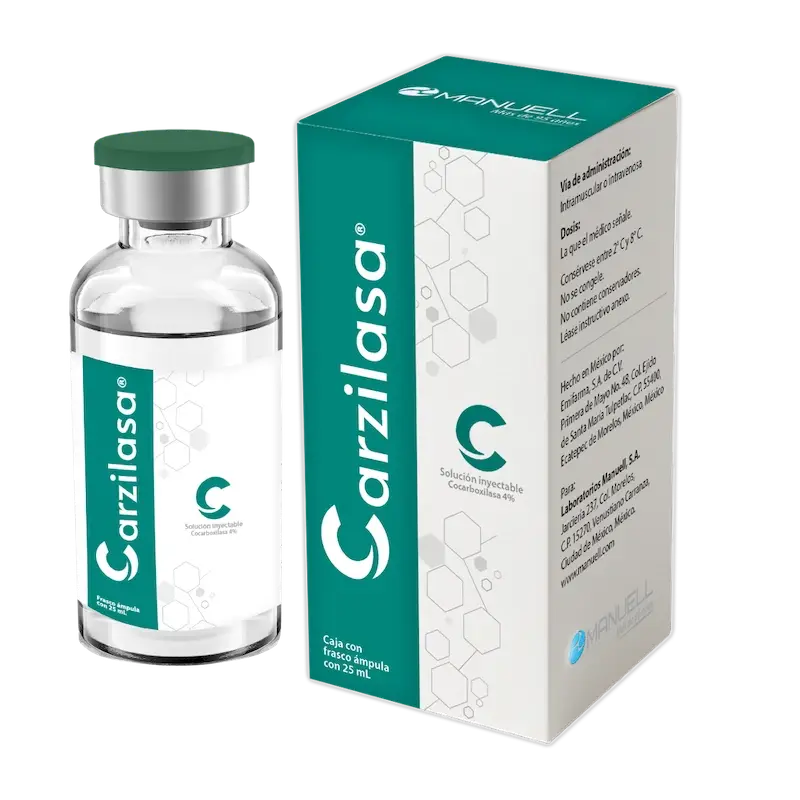 CARZILASA® contiene una solución no degradable de cocarboxilasa o pirofosfato de tiamina que resiste a las hidrolasas del medio interno y le permite llegar con plena actividad enzimática a las mitocondrias celulares donde la molécula interviene en el proceso de obtención de energía de la propia célula. La cocarboxilasa funciona en las células como coenzima en las reacciones intermedias del metabolismo de los carbohidratos, algunas veces oxidando y otras descarboxilando. La presencia de la cocarboxilasa es ineludible para la descarboxilación del ácido pirúvico que en su siguiente paso permite la producción de energía, pues en su ausencia sólo es obtenible precariamente de la glucólisis anaeróbica.